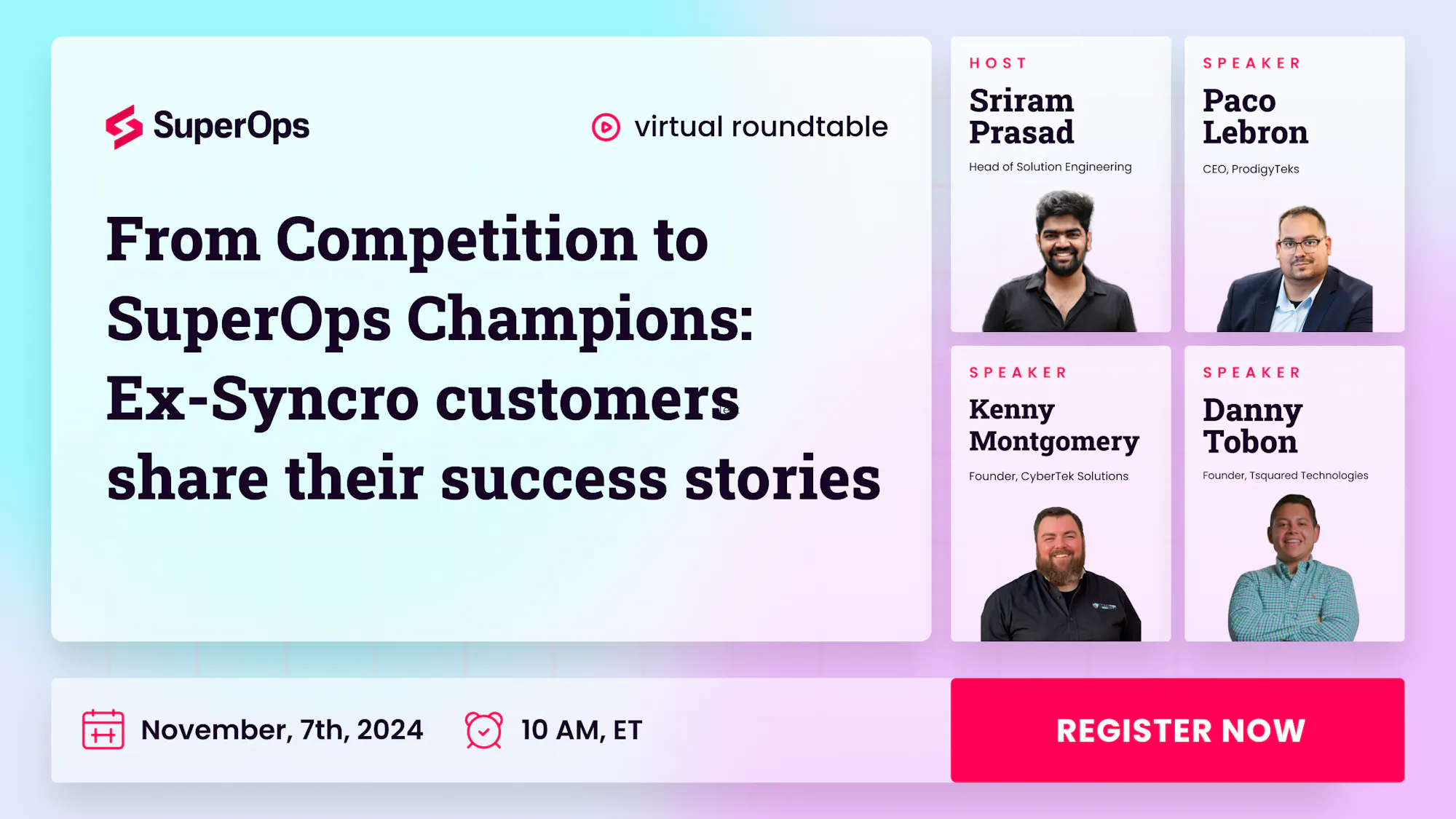 We’re seeing a key trend: many MSPs are switching to SuperOps from legacy platforms. Why? Our customers are saving time, money and improving productivity by consolidating tools into a single, efficient platform. In the first part of a series of sessions on why SuperOps is winning customers over from our competitors, join us for an exclusive virtual roundtable, where former Syncro users share their journey to SuperOps and the transformative impact it’s had on their MSP businesses. Learn firsthand why MSPs are making the switch from Syncro and how SuperOps is empowering them with a unified PSA-RMM platform that boosts efficiency, streamlines operations, and delivers real results.
