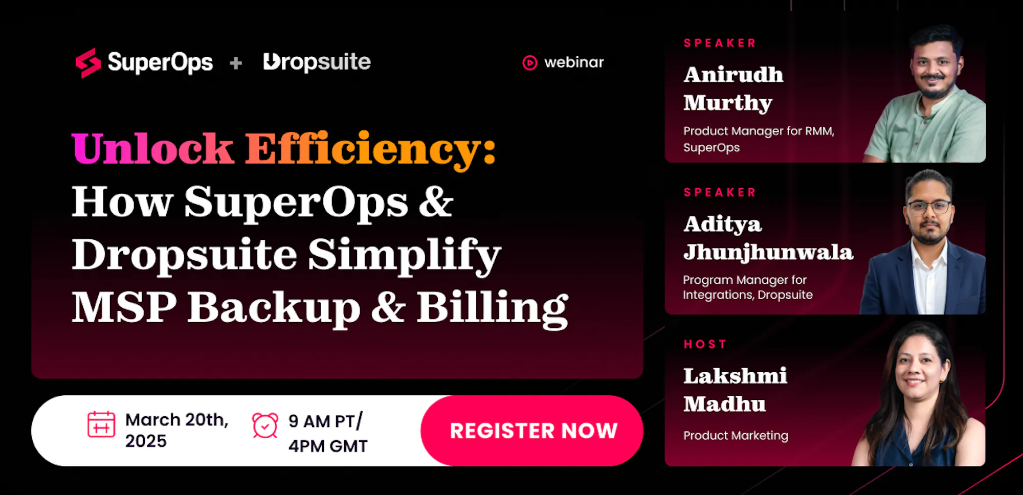 Discover how the Dropsuite and SuperOps integration empowers MSPs with automated alerts, real-time visibility, and reduced operational overhead. Join our webinar to learn how to resolve issues before they escalate and focus on growing your business.